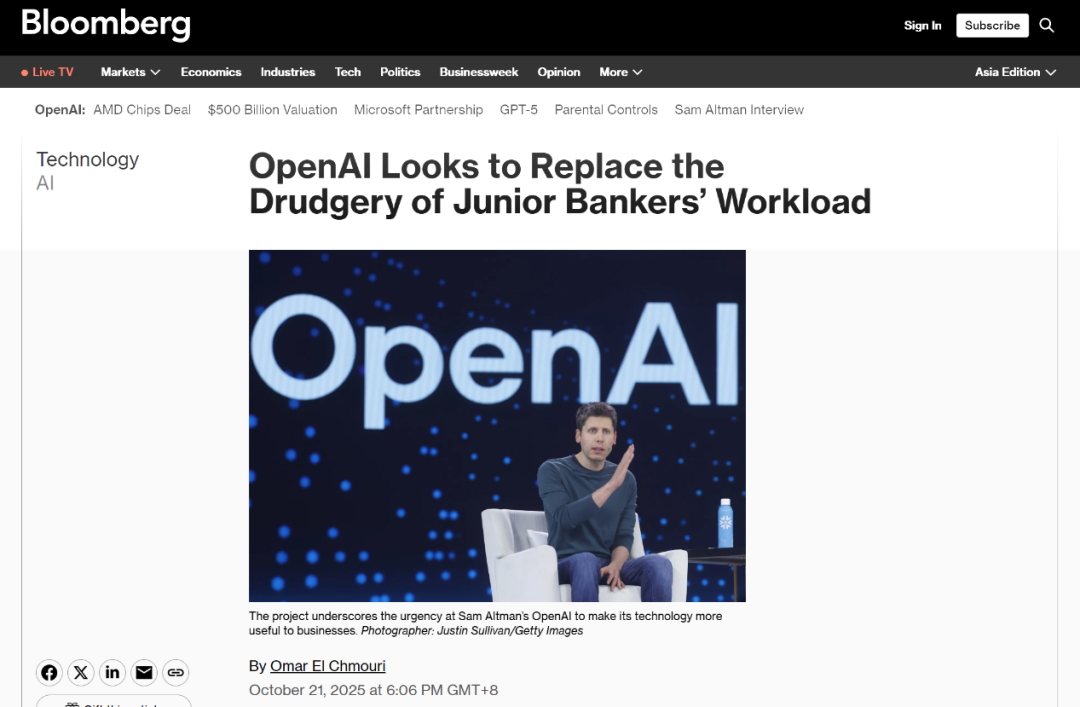 据彭博社10月21日消息,OpenAI正在招募超过100名前投行人员,协助公司训练AI构建金融模型,使模型可完成业内初级银行员每天耗费大量时间完成的基础性工作。