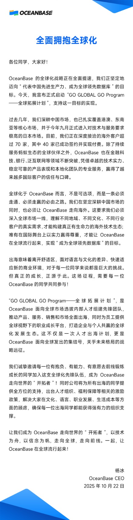 据了解,为加速全球化布局,OceanBase拟通过“GO GLOBAL GO Program”计划,面向全球市场选拔内部人才组建先锋团队,推动产品、服务、销售和市场全面出海。