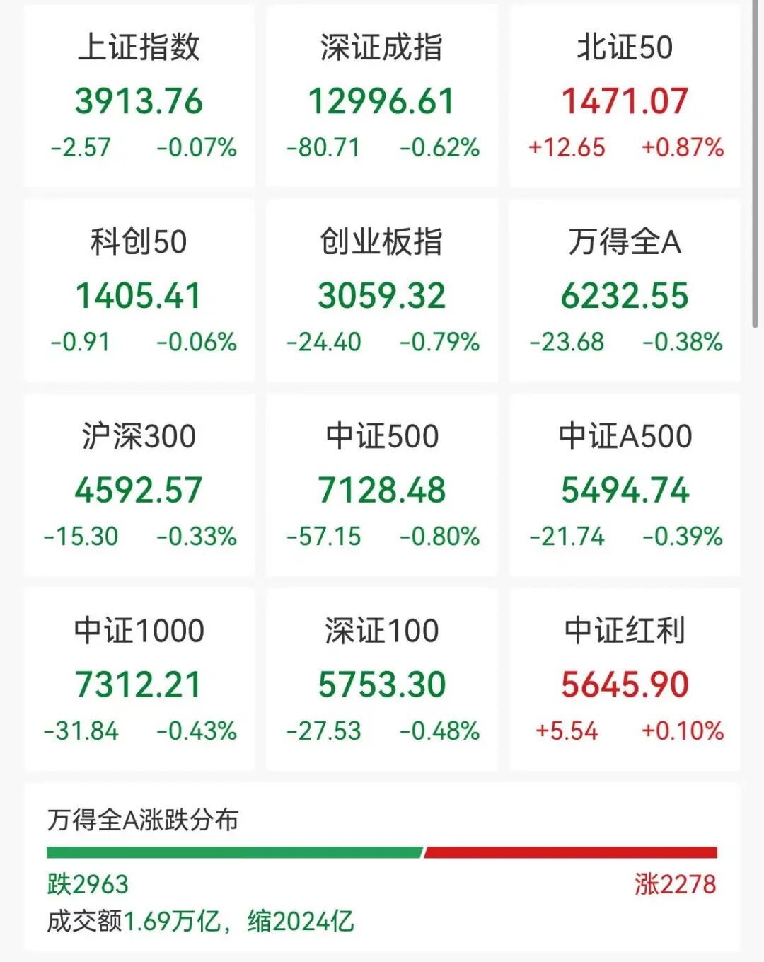 10月22日,A股市场全天弱势震荡,三大指数盘中翻红后均出现回落。截至收盘,沪指跌0.07%,深成指跌0.62%,创业板指跌0.79%。沪深两市成交额1.69万亿,量能进一步萎缩,较上一个交易日缩量2024亿。