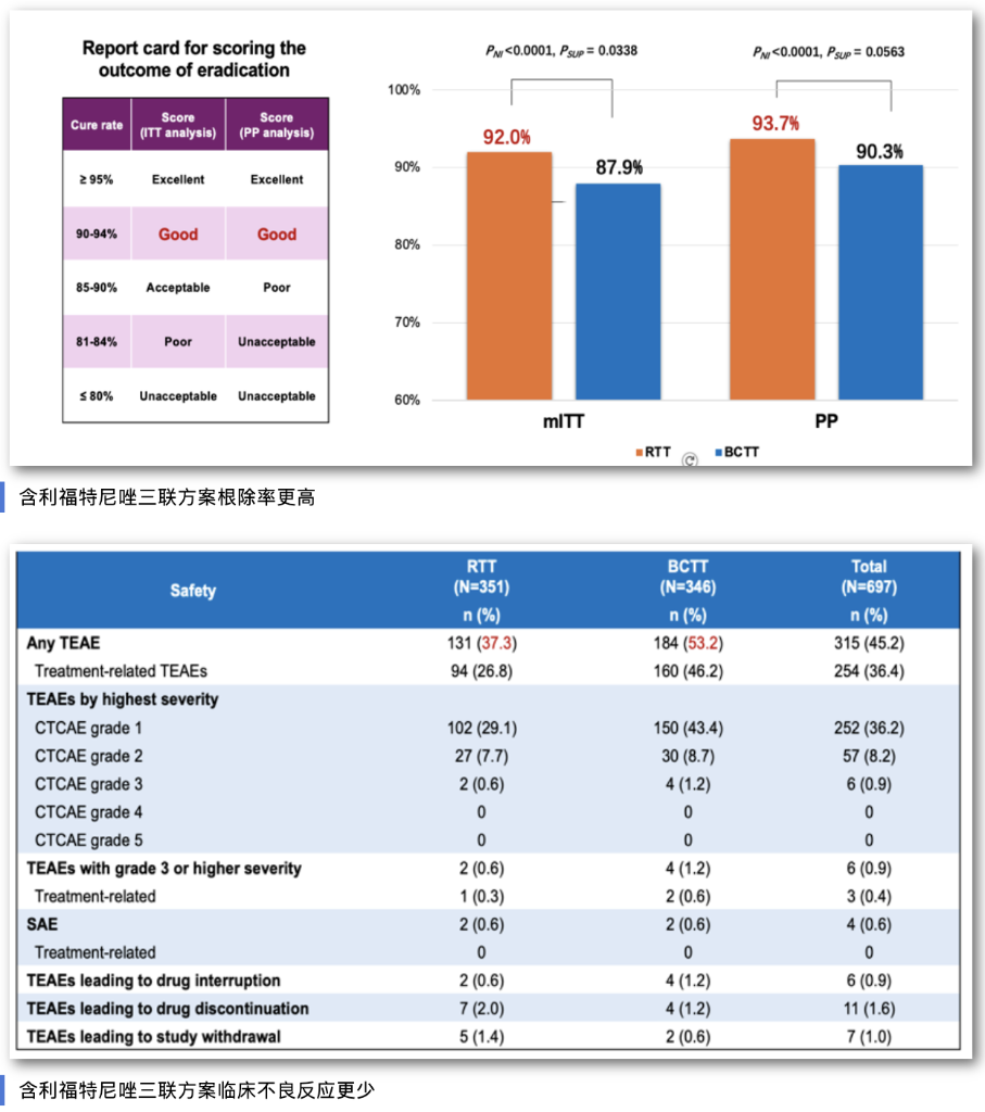 北京大学第三医院消化科周丽雅、宋志强教授团队带领全国40家医疗机构消化疾病诊疗中心,通过全球首个Ⅲ期临床试验,证实了含利福特尼唑的三联方案,比临床上常用的铋剂四联方案具有更高的根除成功率和更低的不良反应发生率,而且用药更少,服用更方便,将为全球幽门螺杆菌感染者带来了全新的治疗选择。相关成果日前于《柳叶刀-感染病学》在线发表。