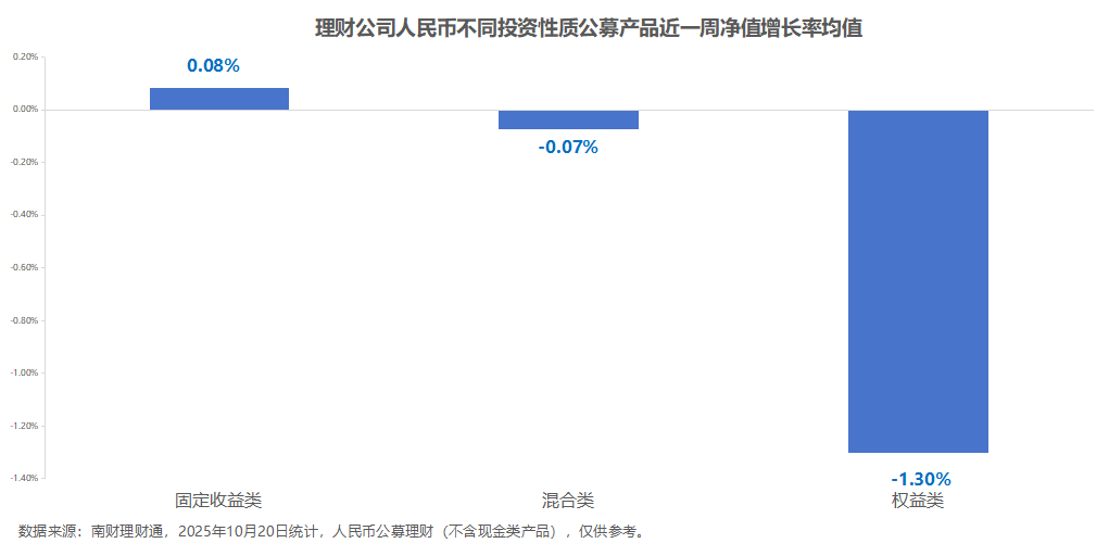 周度收益情况:整体上,截至10月20日,公募人民币理财产品近一周平均净值增长率为0.07%。其中,固定收益类理财近一周平均净值增长率为0.08%,而混合类、权益类近一周平均净值增长率则告负,分别为-0.07%、-1.30%。