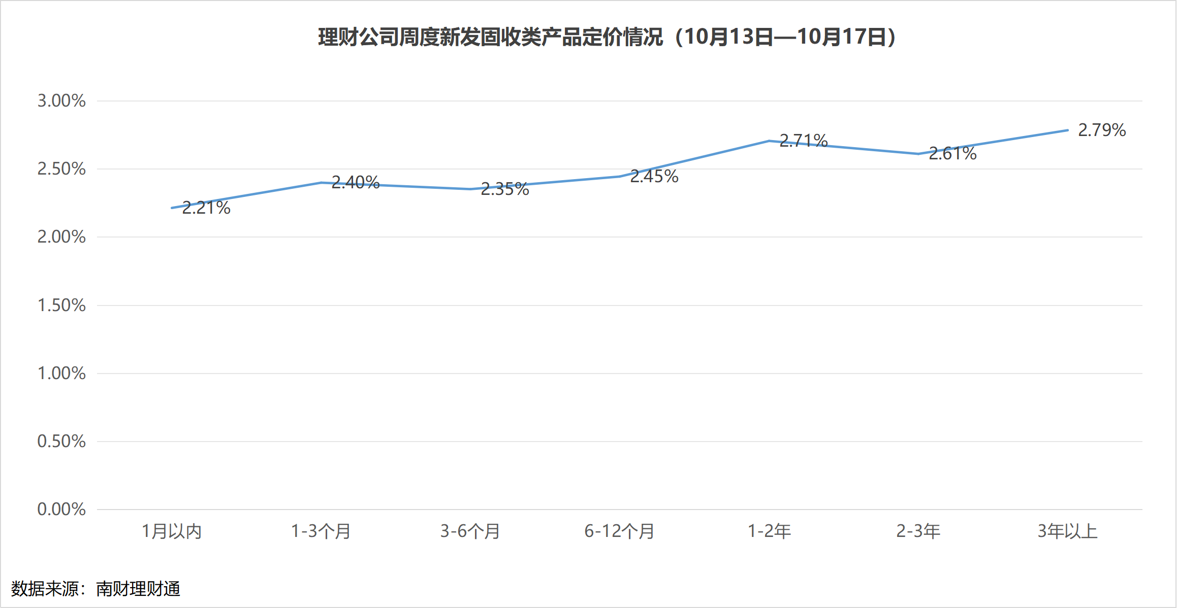 产品定价:上周,不同期限产品定价整体随期限延长而提高,但不完全呈正相关。3—6月期限产品定价低于1—3月期限产品定价,2—3年期限产品定价低于1—2年期限产品定价。总体来看,理财公司新发固收类产品业绩比较基准呈下降趋势,探索和布局多资产多策略产品是理财公司的必然方向。