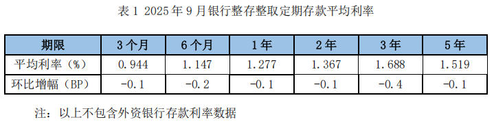在网点定期存款方面,数据显示,2025年9月,银行整存整取存款3个月期平均利率为0.944%,6个月期平均利率为1.147%,1年期平均利率为1.277%,2年期平均利率为1.367%,3年期平均利率为1.688%,5年期平均利率为1.519%,3年期和5年期定期存款平均利率依旧处于倒挂状态。