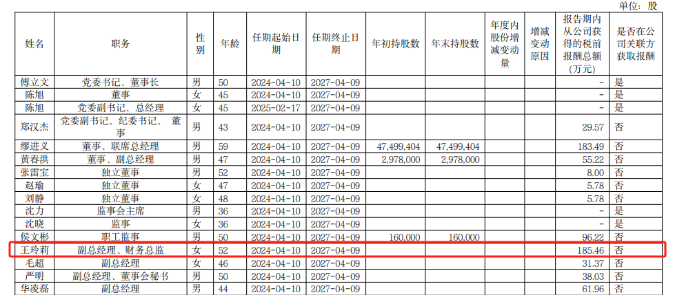 据2024年年报,王玲莉从公司获得的税前报酬总额高达185.46万元,历任话机世界数码连锁集团股份有限公司财务总监、远洲集团股份有限公司财务总监、浙江华策影视股份有限公司财务总监等职务,2024年4月起任公司副总经理、财务总监。
