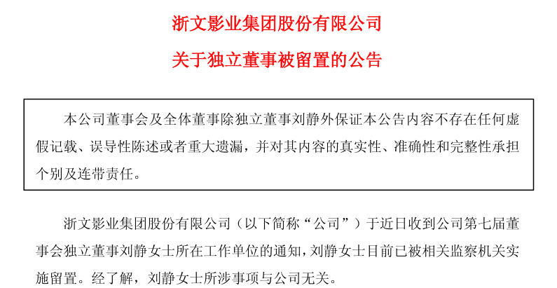 值得一提的是,两个月前,浙文影业独董刘静突遭留置。据8月26日公告,公司于近日收到公司第七届董事会独立董事刘静所在工作单位的通知,刘静已被相关监察机关实施留置。经了解,刘静所涉事项与公司无关。