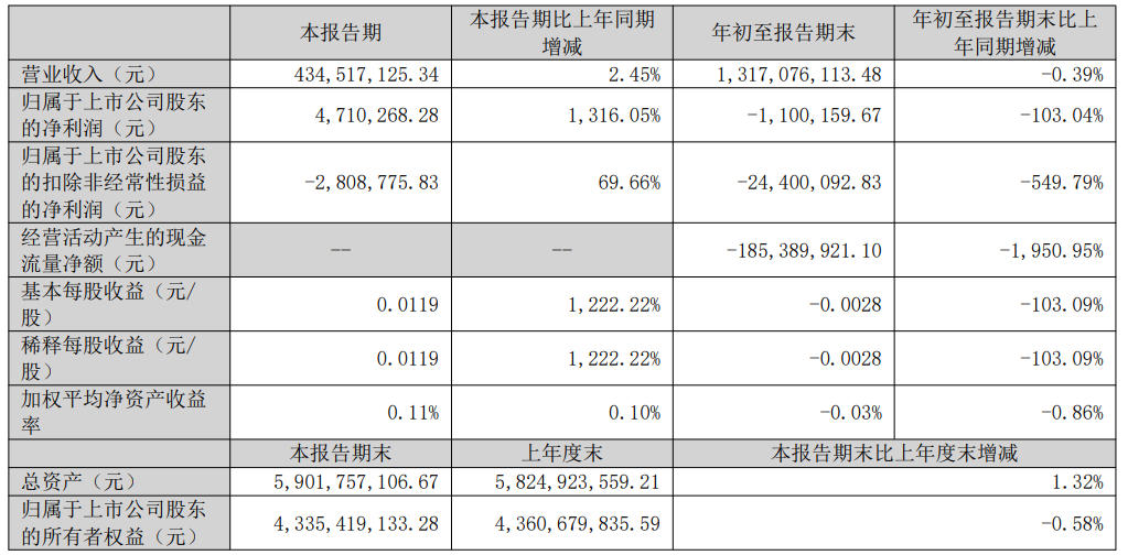 前三季度,公司营业收入为13.2亿元,同比下降0.39%;归母净利润亏损110万元,同比下降103.04%;扣非归母净利润亏损2440万元,同比下降549.79%;经营现金流净额为-1.85亿元,同比下降1951.0%。
