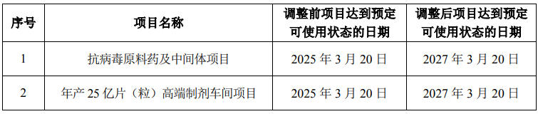 二是,将募投项目“抗病毒原料药及中间体项目”和“年产25亿片(粒)高端制剂车间项目”预计达到可使用状态日期从2025年3月20日均延期至2027年3月20日。