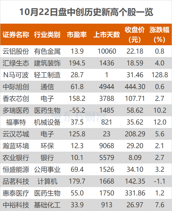 10月22日,沪指今日震荡整理,收盘跌0.07%,收报3913.76点;深证成指跌0.62%,收报12996.61点;创业板指跌0.79%,收报3059.32点。东方财富Choice数据显示,今日有14只个股盘中股价创历史新高,分别为农业银行、中际旭创等。