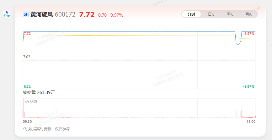 截至2025年10月22日17:30,黄河旋风最新价为7.72元,涨幅9.97%,涨停封板,5日累计涨跌幅达25.53%。成交量261.4万手,成交额19.76亿元,换手率20.48%,显示交易活跃。