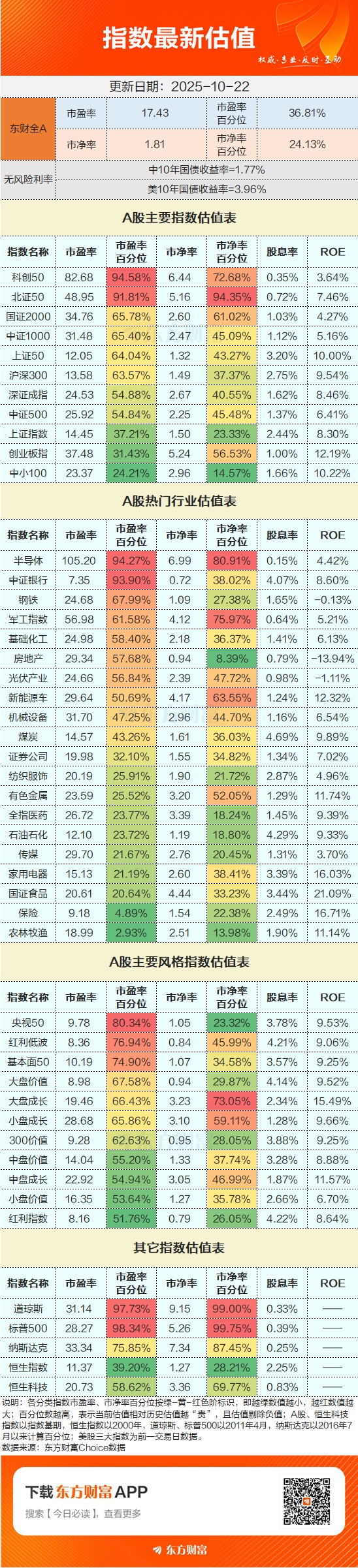 截至10月22日收盘,东方财富Choice数据显示,东财全A市盈率为17.43倍,市盈率百分位为36.81%;市净率为1.81倍,市净率百分位为24.13%。