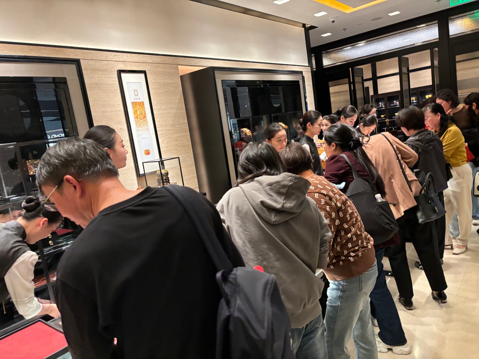 在上海市徐汇区港汇恒隆的老铺黄金店面,记者看到店内人头攒动,队伍从店门口蜿蜒至店内,顾客们摩肩接踵。半小时的排队后,店内已满是挑选金饰的客人。面对金价大跌,店员表示已收到26号涨价的通知,店内金饰均为一口价,品牌每年会调价2~3次,此次已是老铺黄金年内的第三次涨价。