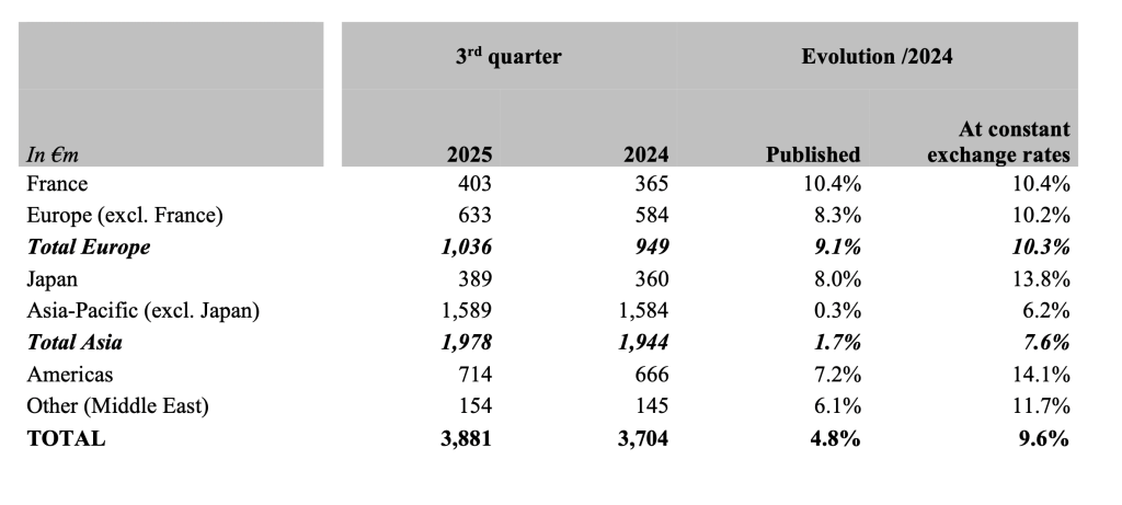第三季度,从各地区来看,亚洲市场(不包括日本)营收15.89亿欧元,按实际汇率计算仅同比增长0.3%,按固定汇率增长6.2%。按实际汇率计算,日本市场营收同比增长8%至3.89亿欧元。法国市场同比增长10.4%至4.03亿欧元,欧洲(不含法国)收入6.33亿欧元,同比增长8.3%。美洲市场收入7.14亿欧元,同比增长7.2%。其他地区(中东)收入1.54亿欧元,同比增长6.1%。