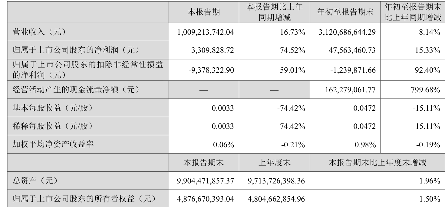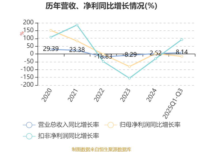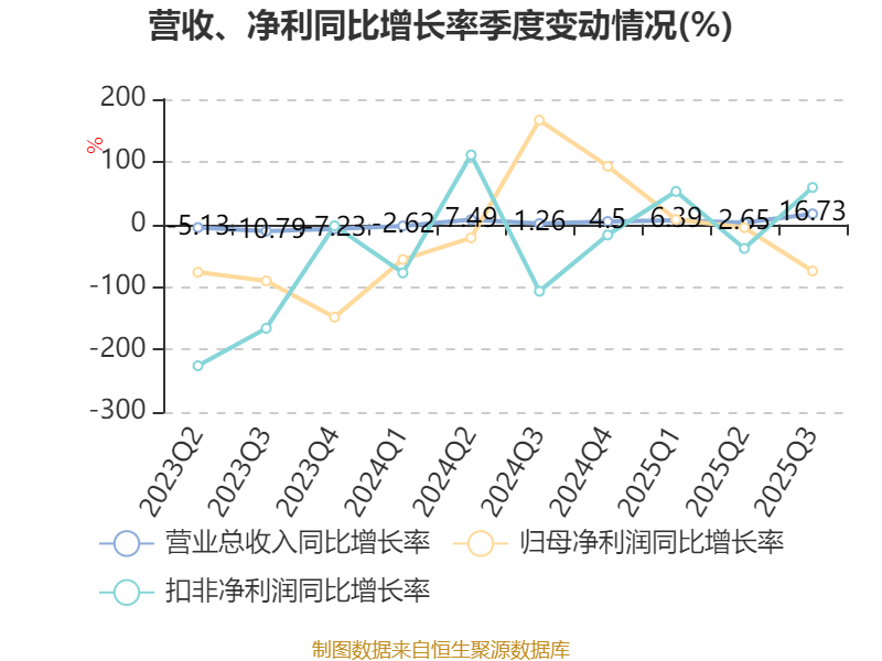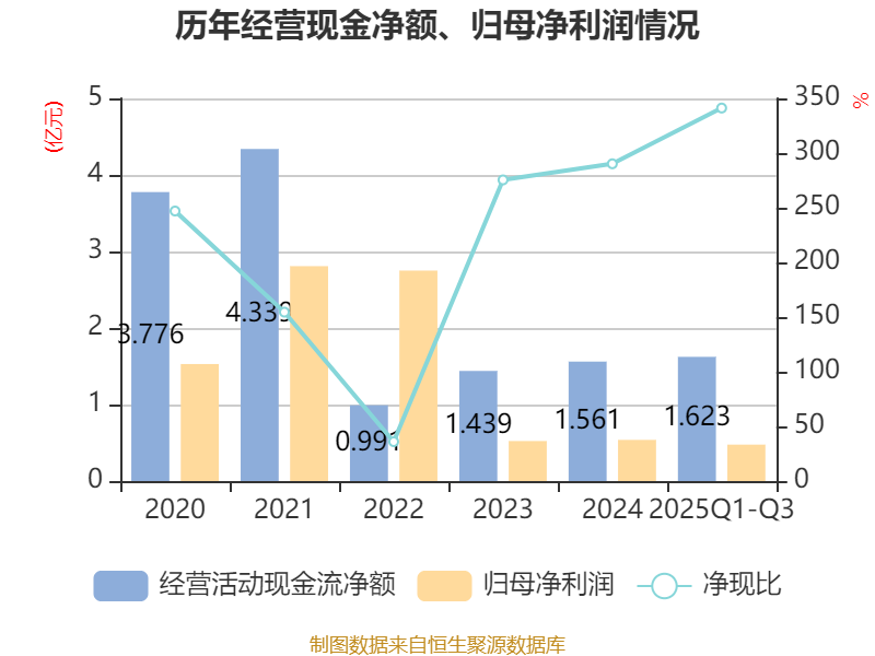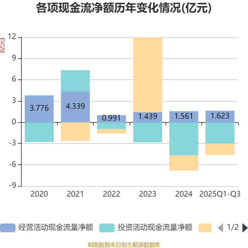2025年前三季度,公司经营活动现金流净额为1.62亿元,同比增加1.85亿元;筹资活动现金流净额-1.6亿元,同比增加4063.89万元;投资活动现金流净额-3.01亿元,上年同期为-4.24亿元。
