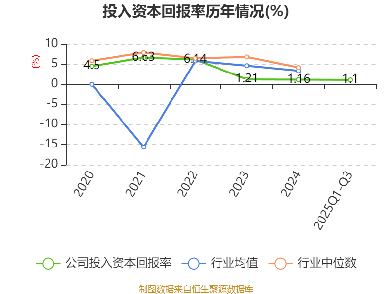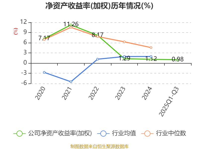 盈利能力方面, 2025年前三季度公司加权平均净资产收益率为0.98%,同比下降0.19个百分点。公司2025年前三季度投入资本回报率为1.1%,较上年同期下降0.17个百分点。