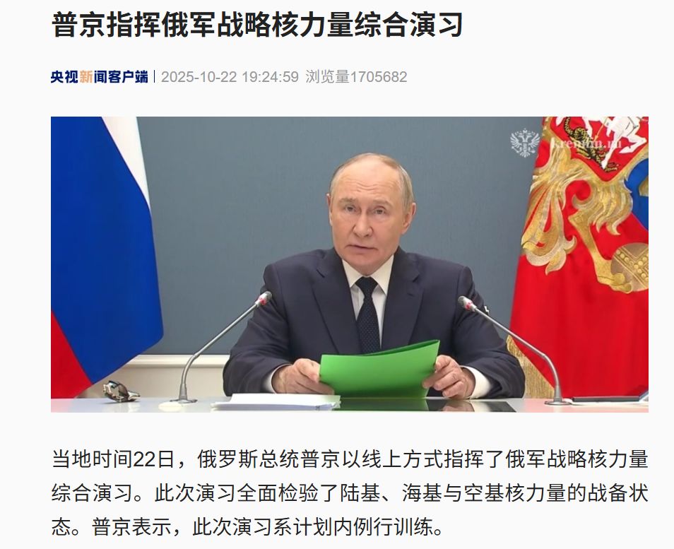 据央视新闻,当地时间10月22日,俄罗斯总统普京以线上方式指挥了俄军战略核力量综合演习。此次演习全面检验了陆基、海基与空基核力量的战备状态。普京表示,此次演习系计划内例行训练。