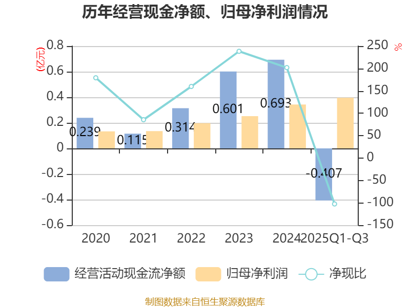 2025年前三季度,公司经营活动现金流净额为-4068.62万元,同比减少588.33万元;筹资活动现金流净额-1996.89万元,同比增加428.3万元;投资活动现金流净额-3191.51万元,上年同期为-403.79万元。