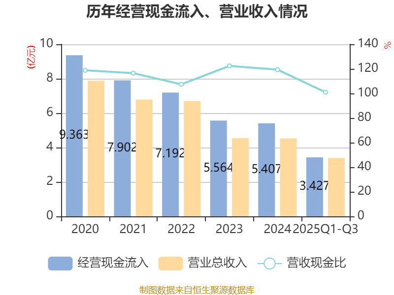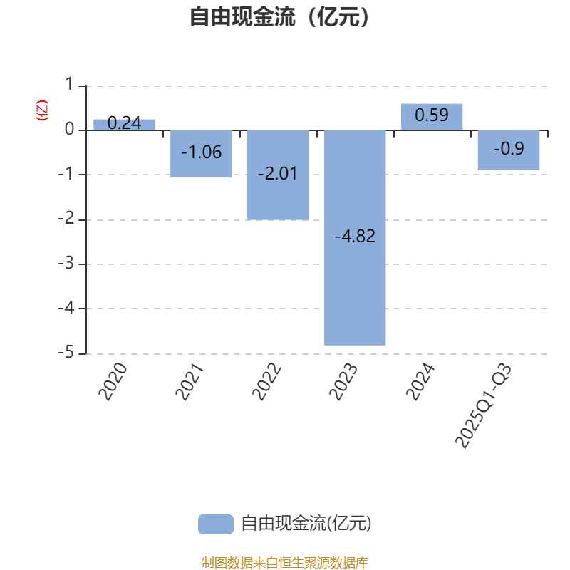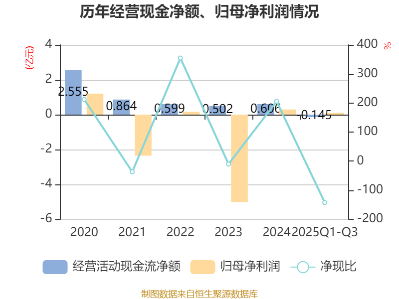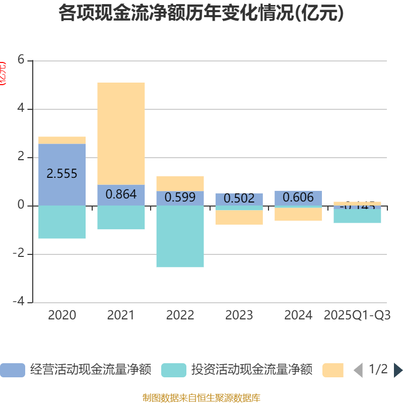 2025年前三季度,公司经营活动现金流净额为-1446.59万元,同比减少4312.44万元;筹资活动现金流净额1537.75万元,同比增加6881.29万元;投资活动现金流净额-5751.14万元,上年同期为-1.48亿元。