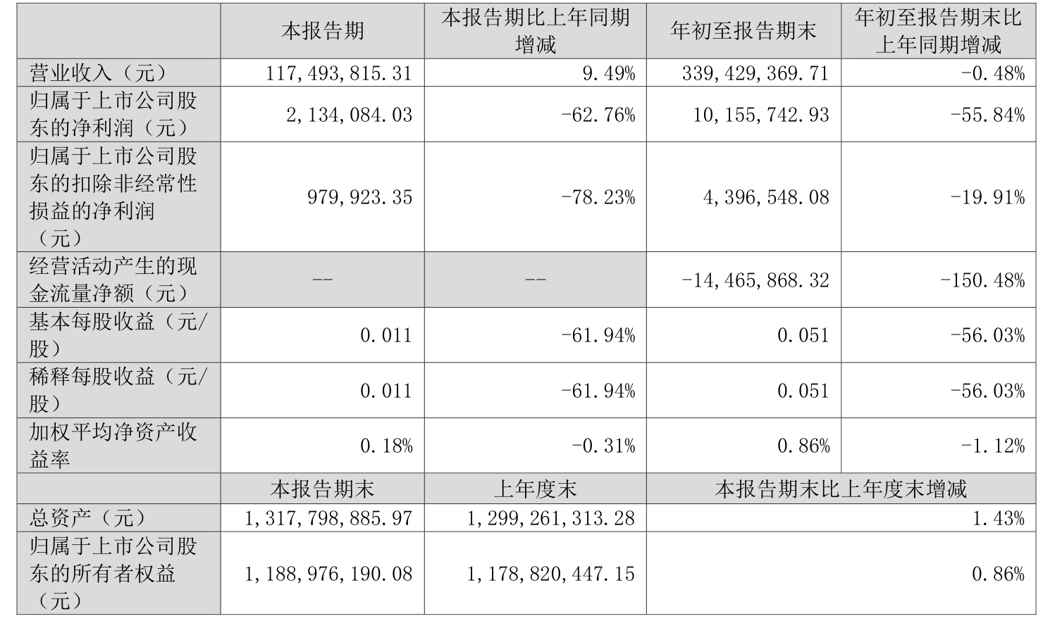 中证智能财讯会畅通讯(300578)10月23日披露2025年第三季度报告。前三季度公司实现营业总收入3.39亿元,同比下降0.48%;归母净利润1015.57万元,同比下降55.84%;扣非净利润439.65万元,同比下降19.91%;经营活动产生的现金流量净额为-1446.59万元,上年同期为2865.85万元;报告期内,会畅通讯基本每股收益为0.051元,加权平均净资产收益率为0.86%。