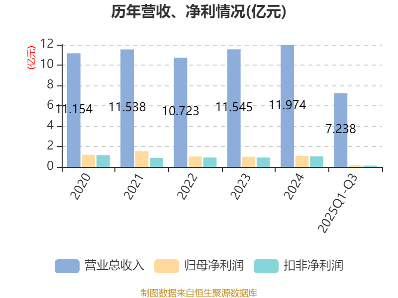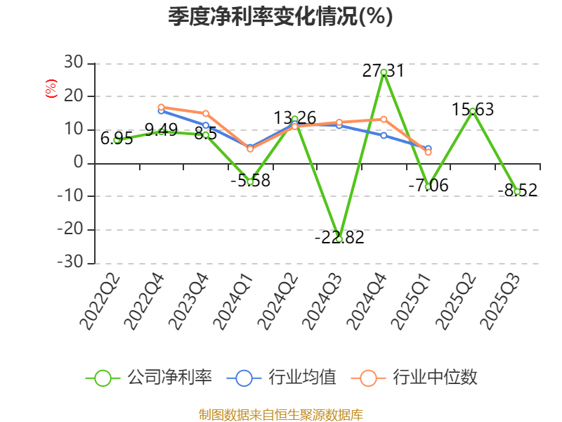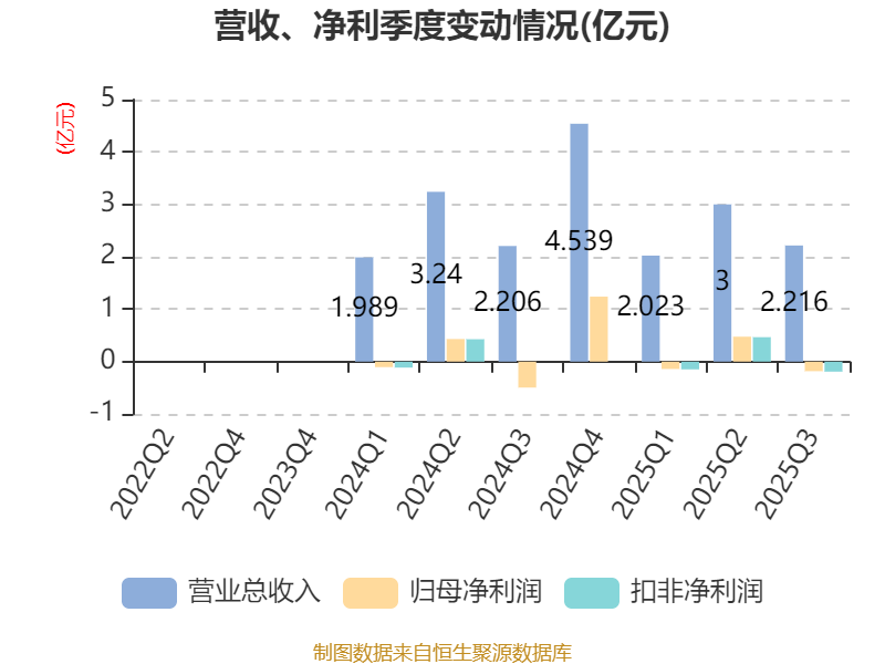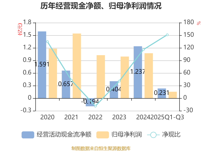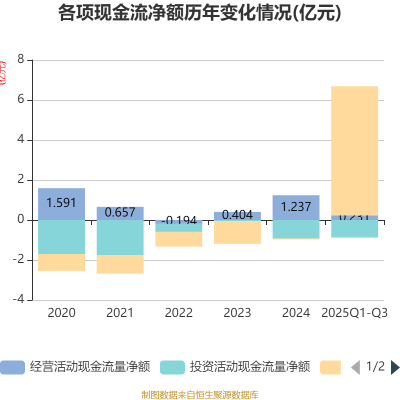 2025年前三季度,公司经营活动现金流净额为2310.72万元,同比增加8168.87万元;筹资活动现金流净额6.46亿元,同比增加6.45亿元;投资活动现金流净额-8781.75万元,上年同期为-3143.6万元。