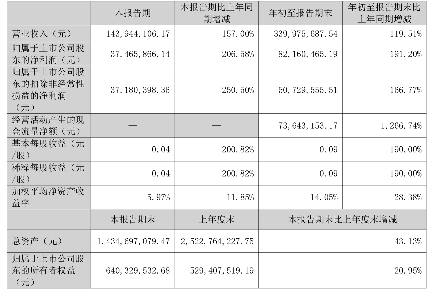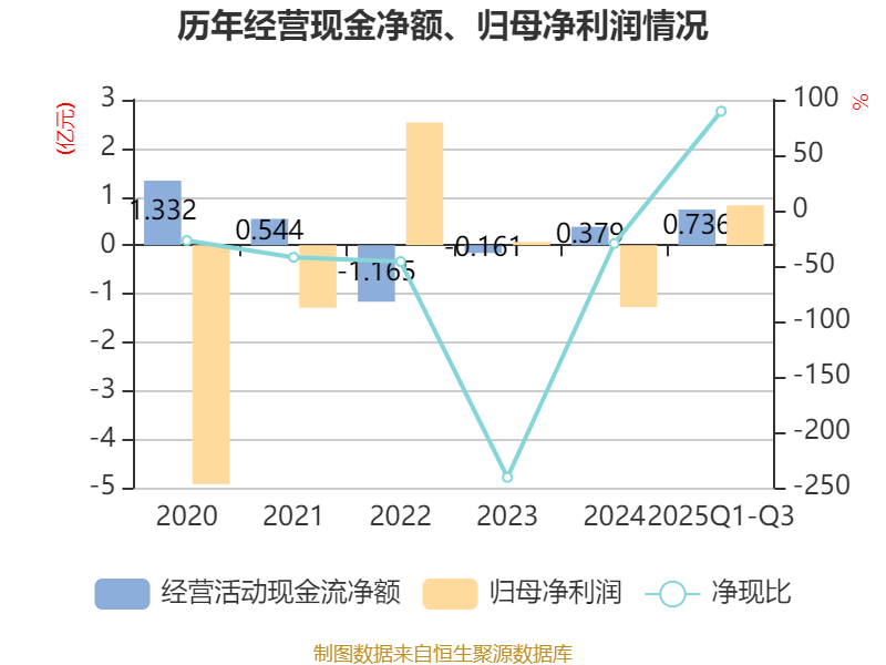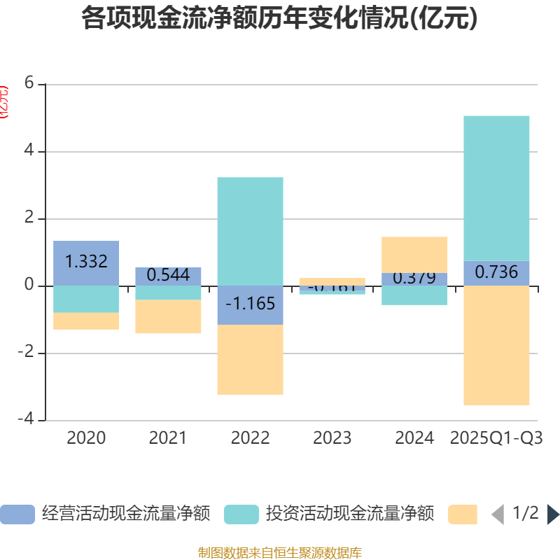 2025年前三季度,公司经营活动现金流净额为7364.32万元,同比增加7995.5万元;筹资活动现金流净额-3.56亿元,同比减少3.74亿元;投资活动现金流净额4.31亿元,上年同期为-1161.46万元。