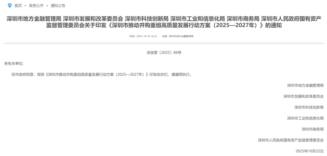 10月22日,深圳市地方金融管理局等印发《深圳市推动并购重组高质量发展行动方案(2025—2027年)》。