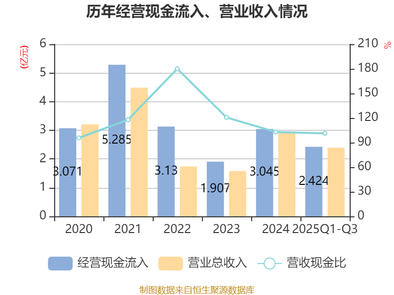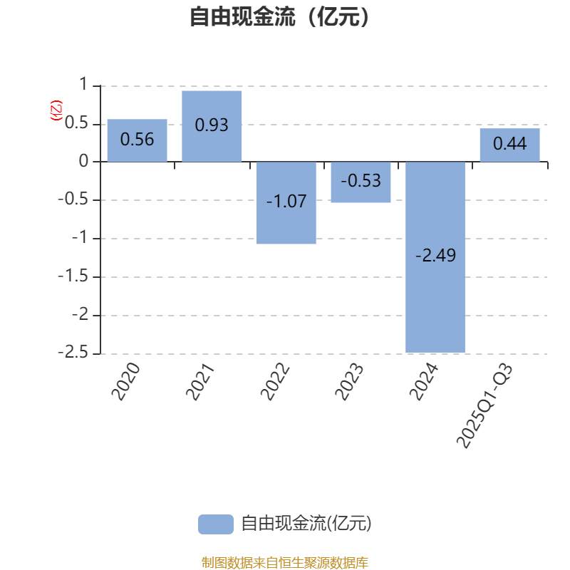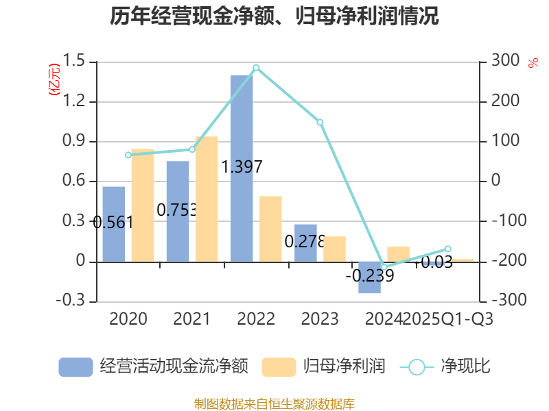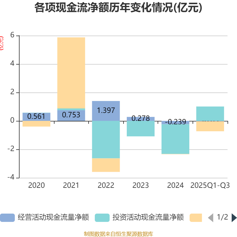 2025年前三季度,公司经营活动现金流净额为-299.98万元,同比增加2755.14万元;筹资活动现金流净额-7010.21万元,同比减少6791万元;投资活动现金流净额1.01亿元,上年同期为-2.16亿元。
