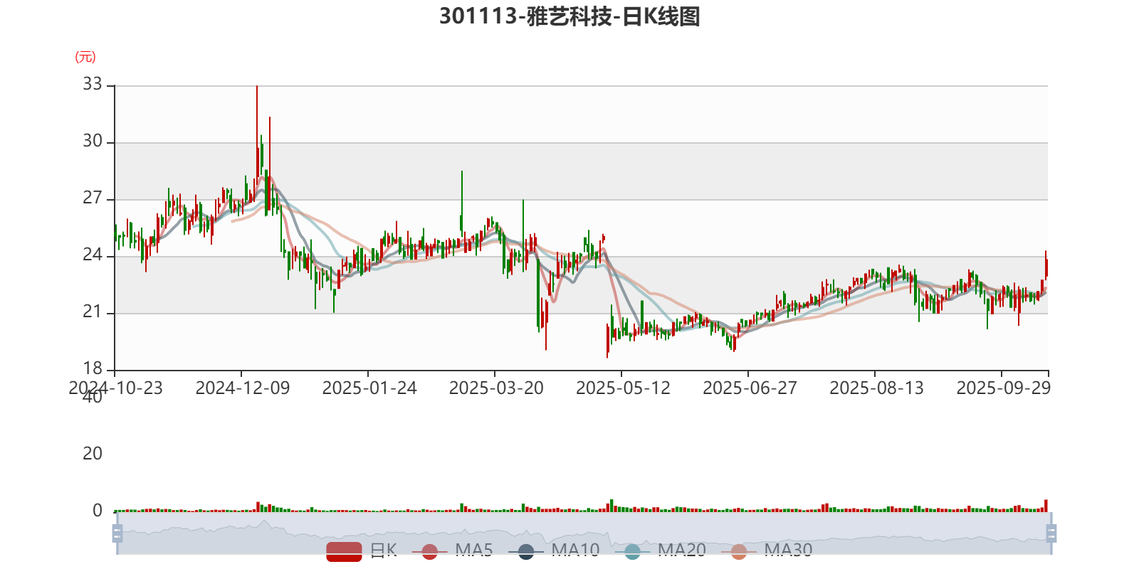 中证智能财讯雅艺科技(301113)10月23日披露2025年第三季度报告。前三季度公司实现营业总收入2.39亿元,同比增长22.23%;归母净利润177.93万元,同比下降68.19%;扣非净利润16.26万元,同比下降95.87%;经营活动产生的现金流量净额为-299.98万元,上年同期为-3055.12万元;报告期内,雅艺科技基本每股收益为0.02元,加权平均净资产收益率为0.25%。公司2025年前三季度分配预案为:拟向全体股东每10股派现0.9元(含税)。