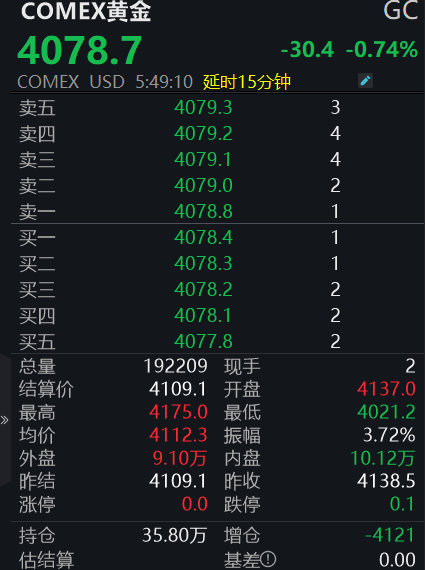 期货方面,COMEX黄金期货亦发生跳水。截至记者发稿,COMEX黄金期货日内跌0.74%,报4078.7美元/盎司,盘中最低触及4021.2美元/盎司。