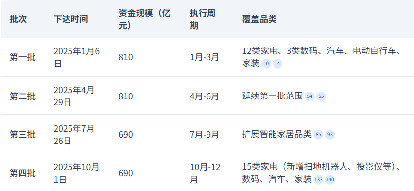 其中,中央财政以超长期特别国债作为核心资金来源,总规模达3000亿元,较 2024年翻倍,全年分四批下达。本轮国补拨付690亿元,与三季度持平,略低于一、二季度。这种 “前松后紧” 的资金分配与双十一大促,加剧了近期国补的竞争难度。
