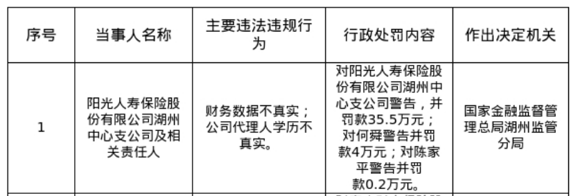 罚单显示,阳光人寿保险股份有限公司湖州中心支公司的主要违法违规事实(案由)为:财务数据不真实;公司代理人学历不真实。