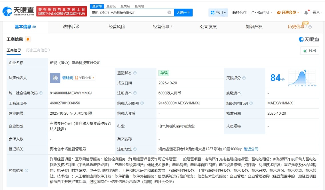 南方财经10月22日电,天眼查App显示,近日,蔚能(澄迈)电池科技有限公司成立,法定代表人为赖晓明,注册资本6000万人民币,经营范围包括电动汽车充电基础设施运营、蓄电池租赁、新能源汽车废旧动力蓄电池回收及梯次利用等。股东信息显示,该公司由武汉蔚能电池资产有限公司全资持股。