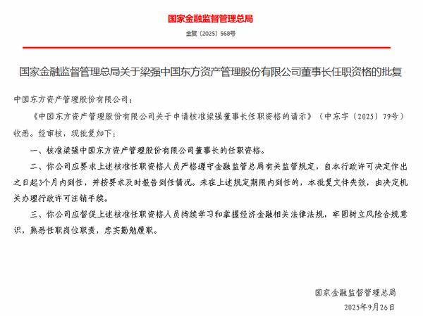 中国网财经10月22日讯近日,国家金融监督管理总局公布批复显示,核准梁强中国东方资产管理股份有限公司董事长的任职资格。