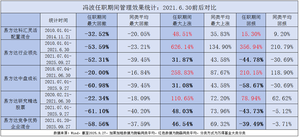 事实上,由于2021年以来的市场变化,偏股类基金的规模增长和业绩表现,整体上受到了较大的影响,而从冯波已卸任的5只基金,以2021年6月末为分界线进行分别统计发现,此前此后的区间最大回撤都远高于同类平均,且震荡回调期间(2021.7.1-2025.9.27)的业绩则全部“变脸”,最大上涨和区间回报都大幅低于同类平均。