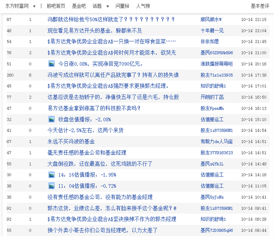 而对于丘栋荣的离任,投资者给出了与易方达冯波截然不同的情绪,更多的是依依不舍,至今仍在怀念,希望公募圈内多一些这样“始终如一”的长情长青型主动管理基金经理。