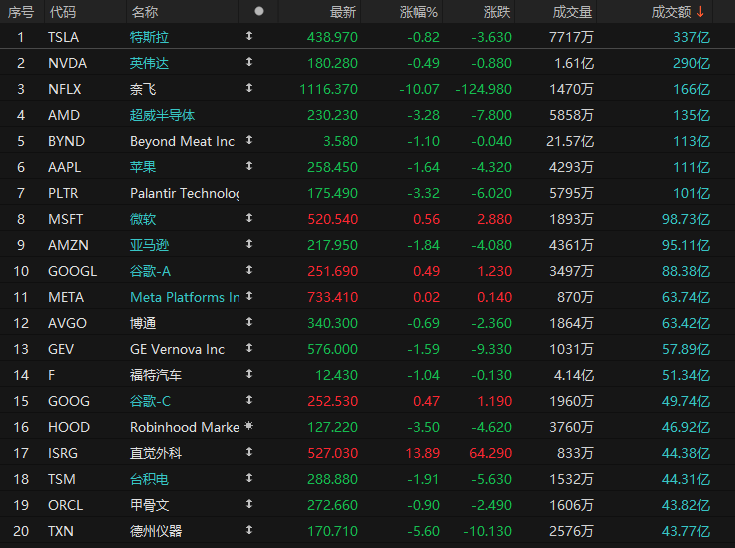 美股成交额前20:奈飞跌超10% 因公司第三财季业绩意外不及预期