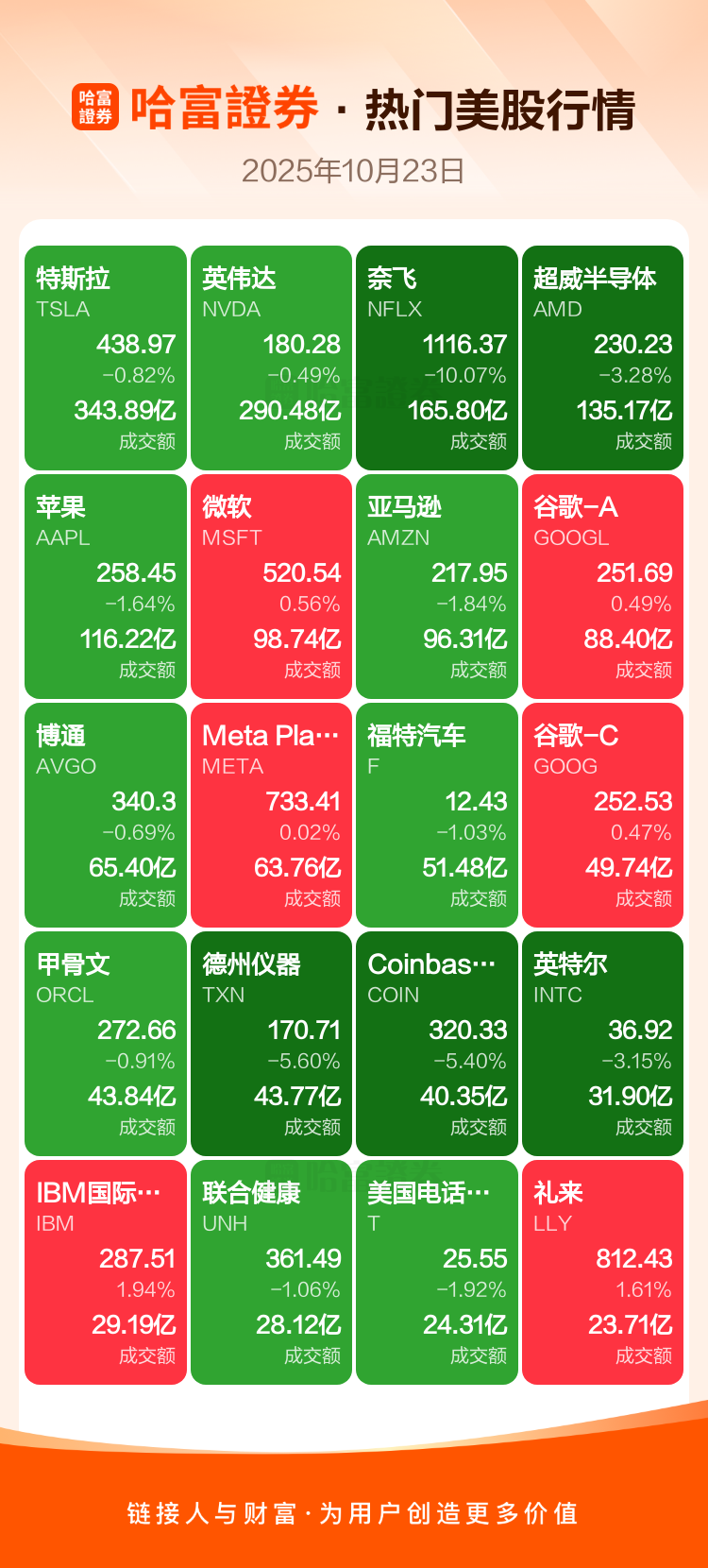 特斯拉跌0.82%,英伟达跌0.49%,奈飞跌10.07%,超威半导体跌3.28%,苹果跌1.64%,微软涨0.56%,亚马逊跌1.84%,谷歌-A涨0.49%,博通跌0.69%,Meta Platforms Inc-A涨0.02%。