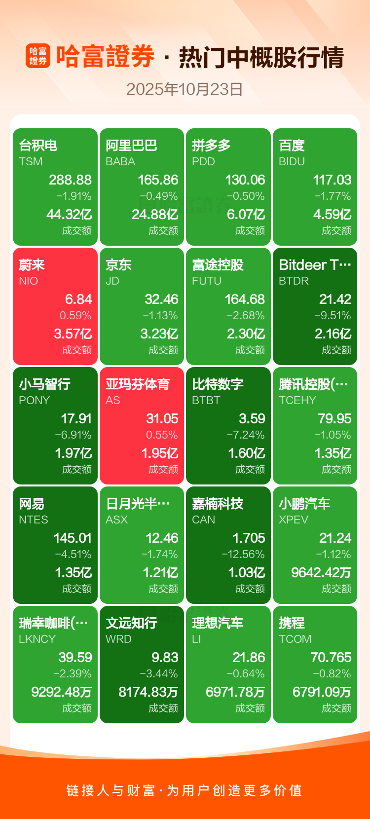 台积电跌1.91%,阿里巴巴跌0.49%,拼多多跌0.50%,百度跌1.77%,蔚来涨0.59%,京东跌1.13%,富途控股跌2.68%,Bitdeer Technologies Group-A跌9.51%,小马智行跌6.91%,亚玛芬体育涨0.55%。