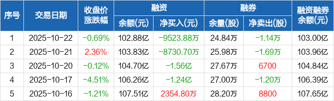 融资方面,当日融资买入1.58亿元,融资偿还2.54亿元,融资净偿还9523.88万元,净偿还额两市排名第11,连续4日净偿还累计4.63亿元。融券方面,融券卖出1.51万股,融券偿还2.65万股,融券余量24.84万股,融券余额1218.15万元。融资融券余额合计103亿元。