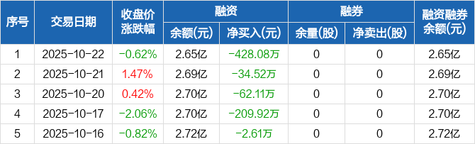 融资方面,当日融资买入747.81万元,融资偿还1175.9万元,融资净偿还428.08万元,连续6日净偿还累计1555.74万元。融券方面,融券卖出0股,融券偿还0股,融券余量0股,融券余额0元。融资融券余额合计2.65亿元。