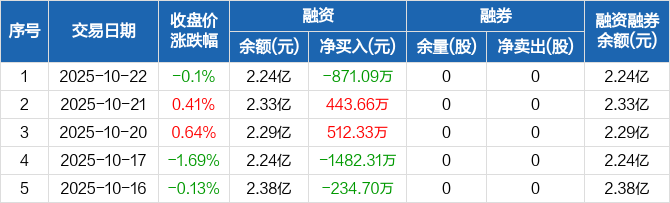 融资方面,当日融资买入680.55万元,融资偿还1551.64万元,融资净偿还871.09万元。融券方面,融券卖出0股,融券偿还0股,融券余量0股,融券余额0元。融资融券余额合计2.24亿元。