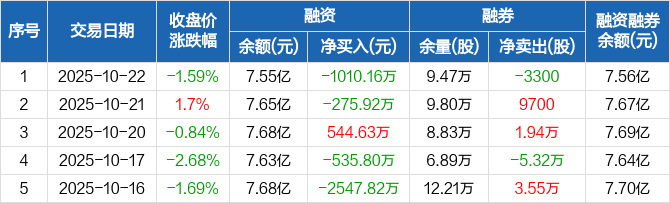 融资方面,当日融资买入3702.91万元,融资偿还4713.08万元,融资净偿还1010.16万元。融券方面,融券卖出1000股,融券偿还4300股,融券余量9.47万股,融券余额122.73万元。融资融券余额合计7.56亿元。