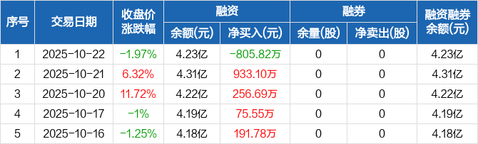 迪威尔:融资净偿还805.82万元,融资余额4.23亿元(10-22)