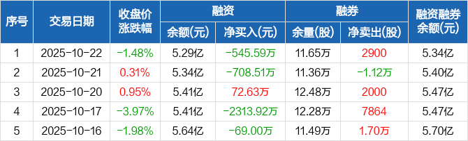 融资方面,当日融资买入1801.09万元,融资偿还2346.68万元,融资净偿还545.59万元。融券方面,融券卖出3700股,融券偿还800股,融券余量11.65万股,融券余额551.04万元。融资融券余额合计5.34亿元。