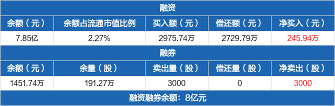 融资方面,当日融资买入2975.74万元,融资偿还2729.79万元,融资净买入245.94万元,连续4日净买入累计1.78亿元。融券方面,融券卖出3000股,融券偿还0股,融券余量191.27万股,融券余额1451.74万元。融资融券余额合计8亿元。