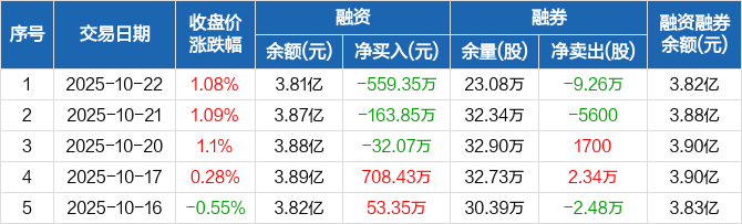 融资方面,当日融资买入1722.97万元,融资偿还2282.32万元,融资净偿还559.35万元,连续3日净偿还累计755.27万元。融券方面,融券卖出1.43万股,融券偿还10.69万股,融券余量23.08万股,融券余额86.78万元。融资融券余额合计3.82亿元。