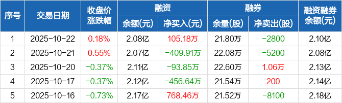 融资方面,当日融资买入547.28万元,融资偿还442.1万元,融资净买入105.18万元。融券方面,融券卖出4000股,融券偿还6800股,融券余量21.8万股,融券余额119.04万元。融资融券余额合计2.1亿元。