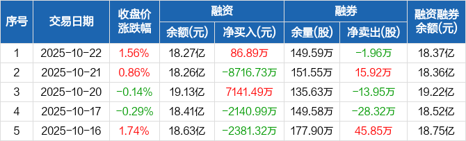 融资方面,当日融资买入1亿元,融资偿还9929.1万元,融资净买入86.89万元。融券方面,融券卖出6.94万股,融券偿还8.9万股,融券余量149.59万股,融券余额1068.07万元。融资融券余额合计18.37亿元。