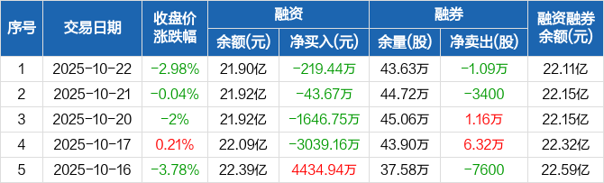 融资方面,当日融资买入1.49亿元,融资偿还1.51亿元,融资净偿还219.44万元,连续4日净偿还累计4949.02万元。融券方面,融券卖出300股,融券偿还1.12万股,融券余量43.63万股,融券余额2156.59万元。融资融券余额合计22.11亿元。