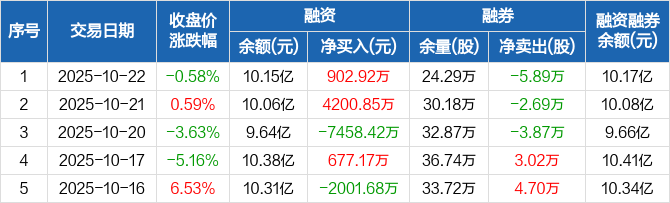 融资方面,当日融资买入1.55亿元,融资偿还1.46亿元,融资净买入902.92万元。融券方面,融券卖出2600股,融券偿还6.15万股,融券余量24.29万股,融券余额206.47万元。融资融券余额合计10.17亿元。