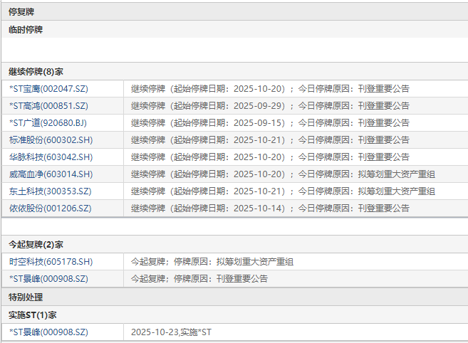 上证报中国证券网讯 10月23日,2家公司复牌:时空科技、*ST景峰。